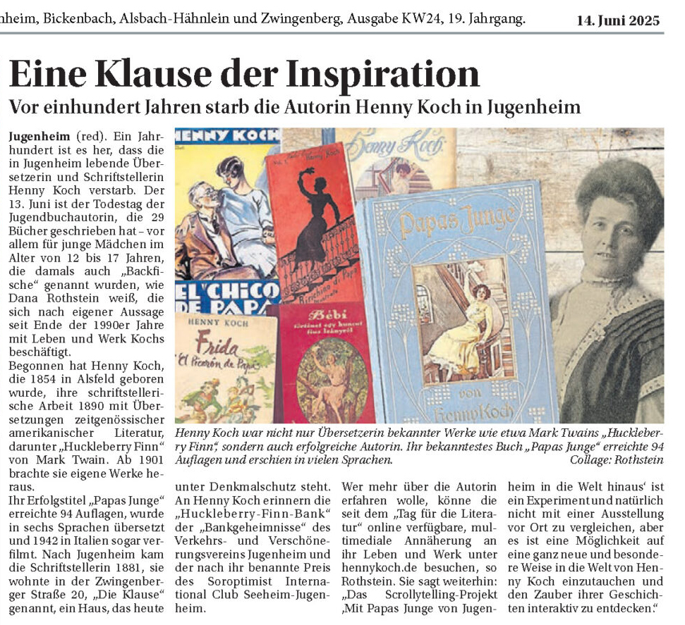 Das Gedenkjahr rund um Henny Kochs 100. Todestag am 13. Juni 2025 hat meiner Forschung und dieser Homepage mal wieder neuen Schwung gegeben. Nach dem Start meiner Henny-Koch-Reise zu ihrem 150. Geburtstag 2004 hatte ich mir immer zum Ziel gesetzt, 2025 erneut zu einem besonderen Jahr zu machen. Nun kann ich auf ein arbeitsintensives Jahr, aber vor allem auf viele bewegende Momente, neue und wiederbelebte Kontakte, interessante neue Impulse und lebendige Erinnerungskultur zurückblicken: